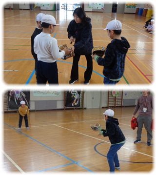 「キャッチ・大谷さん」は、制限時間内に、ペアの子が投げた球をグローブでいくつ受けられるかを競いました。
