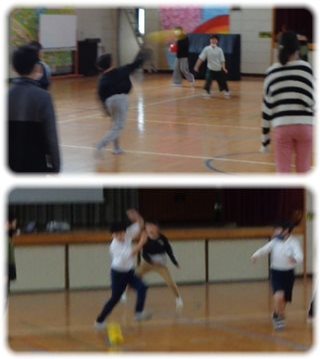 体育館でしていたクラスは、2個のフワフワボールをコートに入れて対戦。