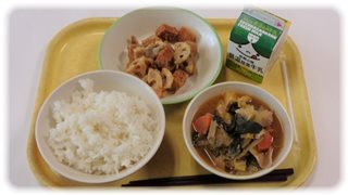 メニュー:まぐろとれんこんの香味あげ、豚汁、米飯、牛乳
