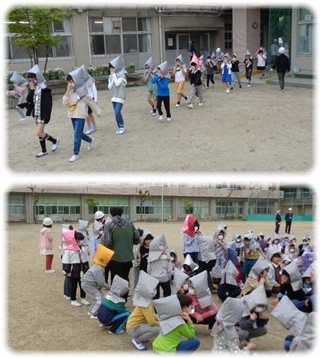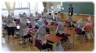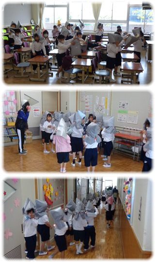 頭を守ることが大事なことを改めて聞いたり、減災頭巾をかぶる練習をしたりしていました。