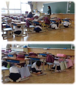 大きな地震が起きるという速報を聞くと、子どもたちは教師の指示で机の下へ。