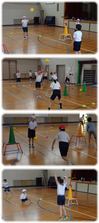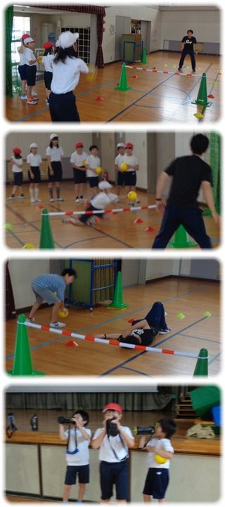 子どもがヒュッと投げられたボールに教師は飛びつくもつかむことができずコロコロコロ。