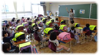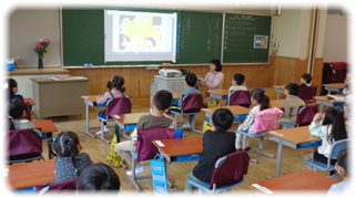 黒板のスクリーンには、子どもたちが開いているページを映して、みんなで声を揃えて読みました。