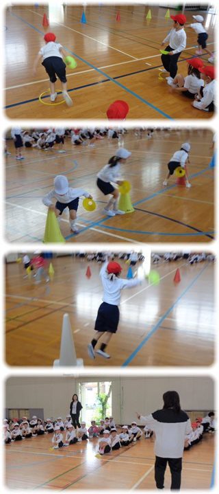 1年生が体育館で、3クラス一緒に“リレー”を楽しんでいました。