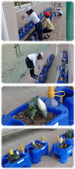今朝も、“マイ ペットボトル じょうろ”でチューリップに水をやっていました。