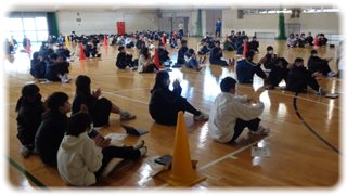 体育館に入った子どもたちは、港中の1年生と合流し、20のグループに分かれて座り、フォーラムに臨みました。