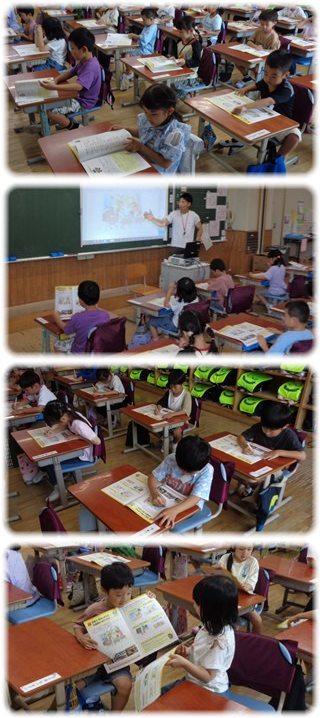 教師と一緒に表紙を開けて、防災キャラクターの“なまずはかせ”のメッセージを読みました。