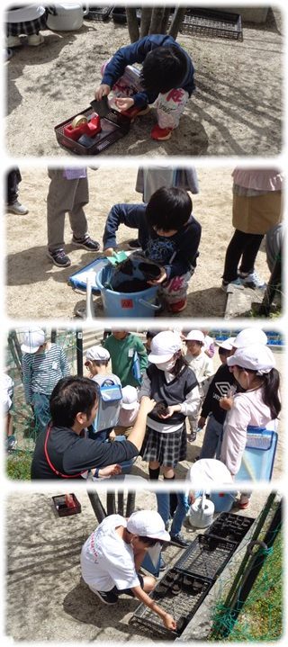 しばらくは、べランでで育てるので、かごにのせて教室へ運びました。