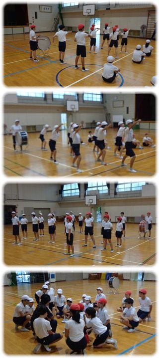 体育館から、勇ましい掛け声と太鼓の音が聞こえてきたので覗いてみると、運動会の応援係の子ども達が、“応援合戦”の練習をしていました。