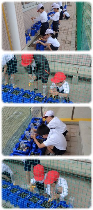 覗くと、何人もの1年生が、マイペットボトルじょうろで、アサガオに水をあげているところでした。