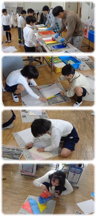 スチレンを自分の新聞紙の上に置いたら、版画和紙をそーっとインクの着いた版の上へ。