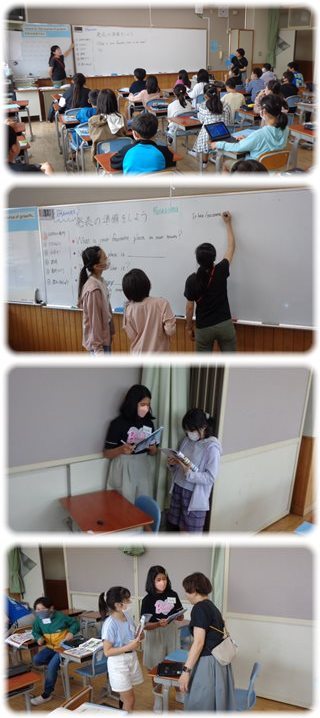 子どもたちは、分からない単語やフレーズがあるとそれを教師に尋ねながら、自分のお気に入りの場所とその理由(そこでできること)を英文に表し、隣の人と、そして、クラスのみんなと聴き合い伝え合ってやり取りを練習していました。