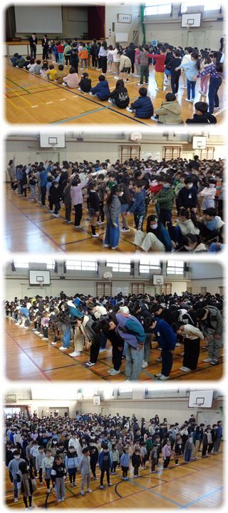 また、3学期は、期間がとても短いが、学年のまとめの学期であり、次の学年への準備をするとても大事な学期なので、やり残しがないように、そしてさらに自分を成長させるために、目標を持って様々なことに挑戦しやり抜いてほしいと、話しました。