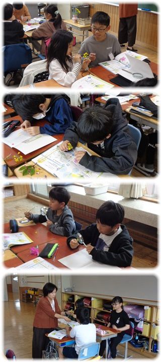 子どもたちは、分解して現れた花の部分を虫めがねで観察し、その様子をノートに書き留めていました。