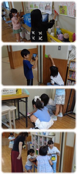 子どもたちは、秘密兵器とタブレットを持って、教室中を探索。
