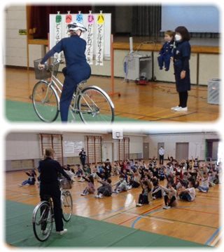 2年生が、四日市市の「とみまつ隊」の指導員を招いて交通安全教室を開き、3つのコーナーで、町を歩いて、また自転車で移動しているときに守ることや気をつけることを学びました。