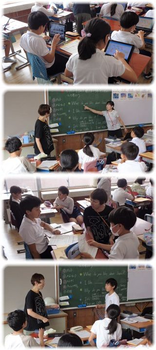 港中の先生と英゛語担当教師のデモンストレーションを見てからペアの子とやり取りをして、互いに尋ねたり答えたりしました。