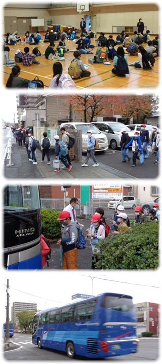 体育館に集まった子どもたちは、見学に向かう心構えや守るべきマナーを確認して学校を発ち、三滝通りからバスに乗って見学先へ向かいました。