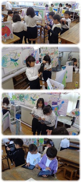 子どもたちは友だちと一緒に、一つ一つ作品を見て回り、「いいな」「すてきだな」「じょうずだな」なんて思った、お気に入りの作品があると、それをタブレットで撮影して写真を取り込み、感想を書き加えていました。