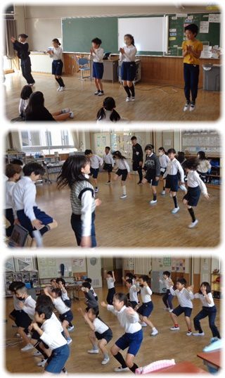 4年の教室から、軽快なリズムの音楽と、それに合わせて