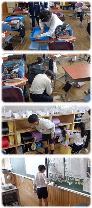自分のひきだしから中のものをすべて出し、消しゴムや濡れた雑巾で汚れを取る子。