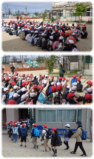 運動場に“きょうだい学級”で集まって教師の話を聞いた後、みんなで