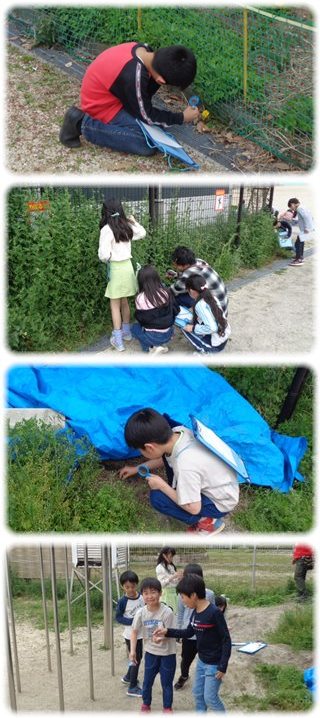 探検ボードと虫めがねを手に、校庭を歩き回ってる3年生。