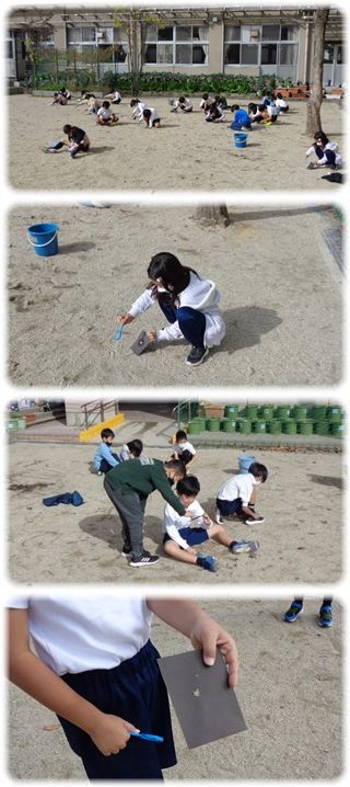 虫めがねと黒い画用紙を持って運動場に出てきた子どもたちは、地面に画用紙を斜めに立て、虫眼鏡を通った日光が画用紙にあたるように調整します。