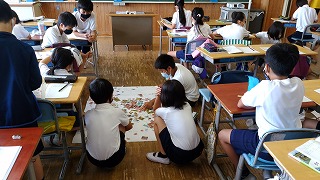 5年生の教室を見に行くと、大きな模造紙に日本地図が書かれ、そこにチラシから切り抜いた商品が、産地別に貼られていました。海外のコーナーもあって、海外からは果物が多い(今はキューイが多い)ようです。私たちが食している食材が全国各地はもちろんですが、世界とつながっていて、食べ物が確保されていることもよくわかります。