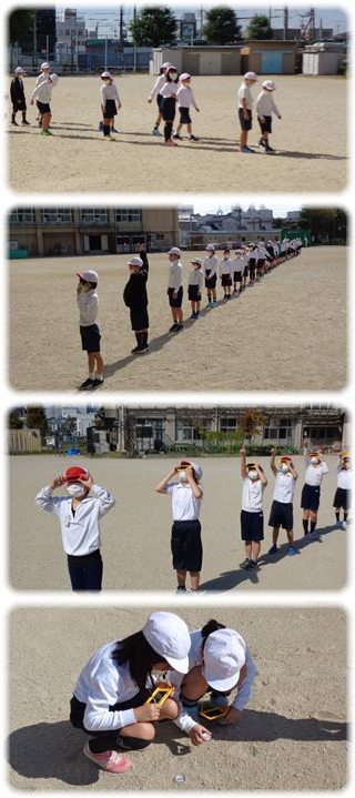 改めて一列に並んで太陽の方向を指さし、遮光板で太陽を見てみると…