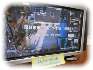 画面下には、「25日は校歌の日」と示したプレートを貼り、こどもたちにもアピールしました。