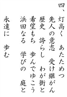 浜田地区の誇りとして、大切にされている浜田小学校の校歌を、毎月25日に流し、今後も大切に歌い継いでまいります。