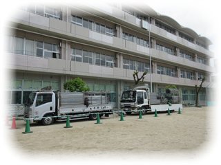 まず、校舎の周りに足場を組む作業のため、トラックがやってきました。