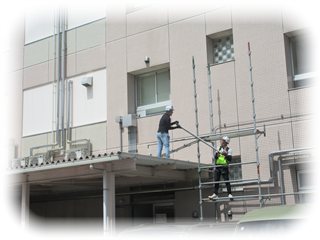 校舎に穴をあけるわけでも、深い支柱を打ち込むわけでもなく、校舎の周りを作業するための足場が着々と組まれていきます。