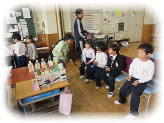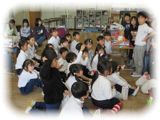 1時間の「おもちゃランド」が終了すると、1年生は中央に集まって、感想を聞かせてくれました。2年生は、自分のお店が「楽しかった」と言ってもらえるかどうか、ドキドキしながら聞いていました。