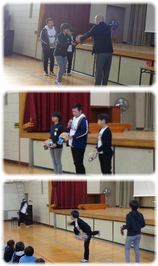 始業式の後、1月5日に届いた贈り物、大谷選手からの3つのグローブを子どもたちに伝達しました。