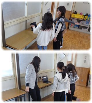 ある係の子どもたちは、タブレットのカメラを“自撮りモード”にし、画面に向き合うようにして4人が並びましたが、後ろにも席があるので全員が納まりきれません。