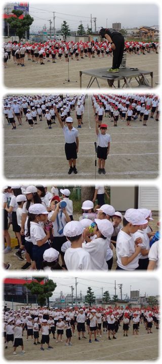 応援席に集まった子どもたちは、先に移動した6年生に続いて開会式の隊形に整列し、まずは、“気をつけ”“礼”“休め”“回れ右”の動きを、指導台の上に立った教師の動きを手本にして練習しました。