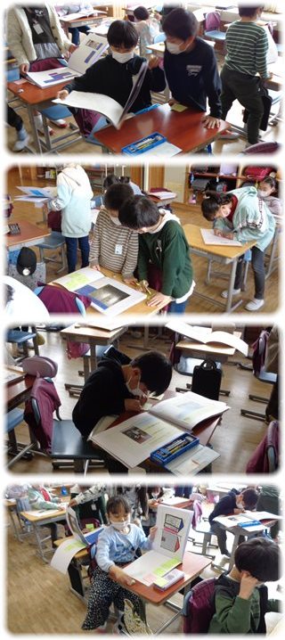 教師にもらった付箋を手に、友だちの「こんなに大きくなったよ」を1冊ずつ読んで回り、感じたことやよいところを付箋に書きこんで、ペタンとはっていました。
