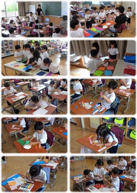 想像を広げて何を作るかを決め、教師から作り方を聞いた子どもたちは、自分の欲しい色画用紙と色紙を持って来て制作に取り掛かりました。