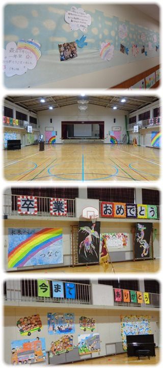 体育館に入ると、キャットウォークの柵には「卒業おめでとう」「今までありがとう」というメッセージボードが掲げられ、壁面は、各学年が作った学校生活の様子を表した壁画と、5年生がこしらえた虹や不死鳥などで飾られています。