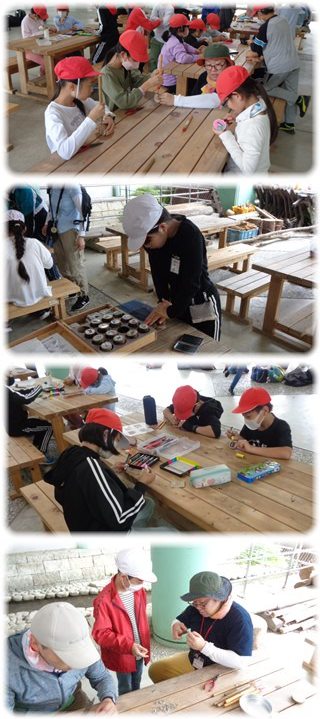 子どもたちは、切り口がツルツル津になるまで、紙やすりでゴシゴシ磨き、いろんな色のペンを使って好きな絵や模様を描いたり、取りや虫、花の絵のスタンプを押して色を着けたりと、思い思いの図柄、方法で装飾を楽しんでいました。