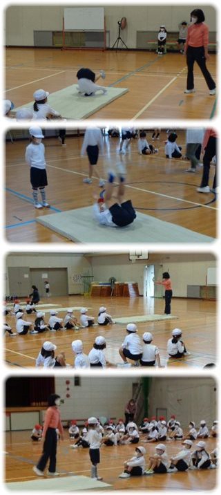 みんなが座ったところで、教師がある子を指名し、この子の前回りをみんなに見せました。
