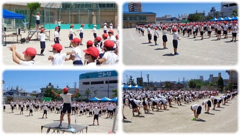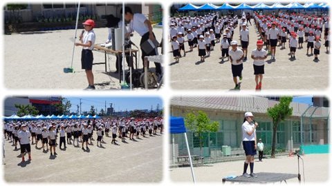 体育委員の子どもたちが列の前に出て子どもたちと向かい合ってお手本となります。