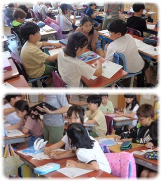 子どもたちは、「倍」を手掛かりにしてもとの車と改良した車の距離と倍の関係をテープ図で表して自分で考え、さらに、ペアの子と、周りの子と一緒に考え、また、図に表したことを説明し合って、解決に迫っていました。