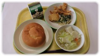 メニュー:鶏肉のからあげ、ナムル、ワンタンスープ、米粉パン、牛乳