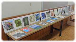 その5年の教室の前には長机が置かれ、その上に宮沢賢治の作品がずらりと並べられています。
