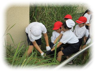 抜いた草は、高学年が集めてくれます。薄いゴミ袋にいれるのは意外と難しいですが、さすがは高学年。見事に収めていきます。