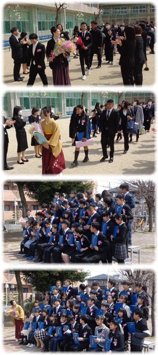 式が終わって30分後。在校生を代表して式に参列した5年生と教職員で運動場に作った花道を、花束を抱えた担任を先頭に、卒業生とその保護者の皆さんが歩いてきました。