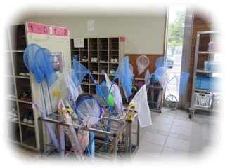 こどもたちが楽しみにいていた「虫取り」の活動が計画されていたため、傘立てには虫取り網がたくさん。